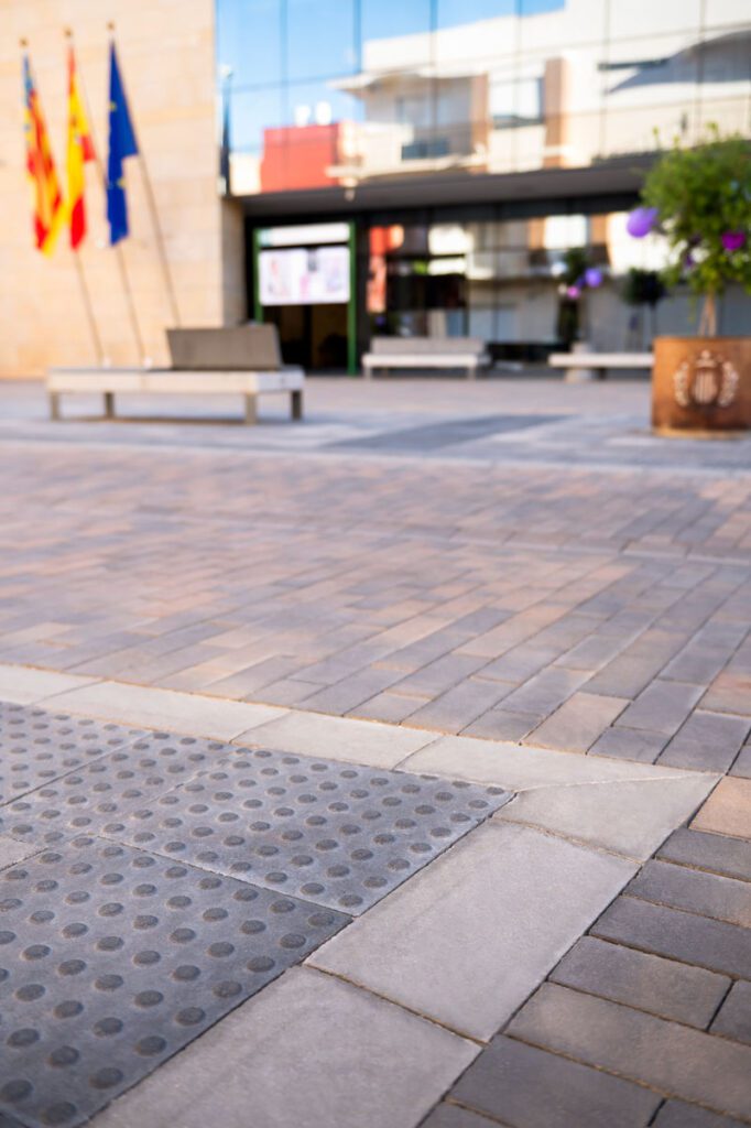 - Versatilidad de diseño. Los pavimentos táctiles de Fenollar permiten cumplir la normativa sin sacrificar la estética urbana. Disponibles en diversos formatos, espesores y colores, facilitan el contraste cromático exigido por el DB-SUA integrándose armónicamente en el entorno.